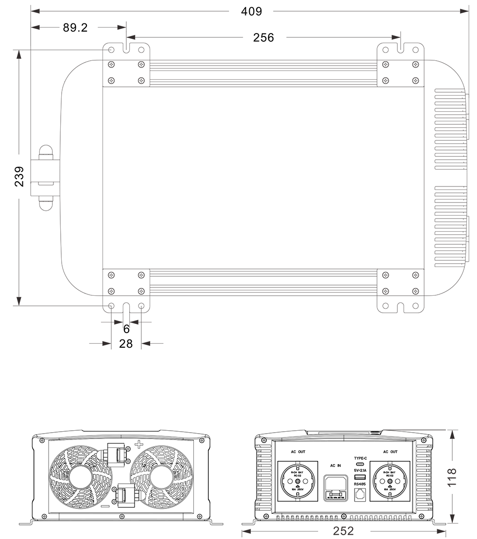 Comutator de transfer ATS standard: Invertor la utilitate AC: 8 ~ 10 ms.; Utilitar AC la invertor: 16 ~ 25 ms.