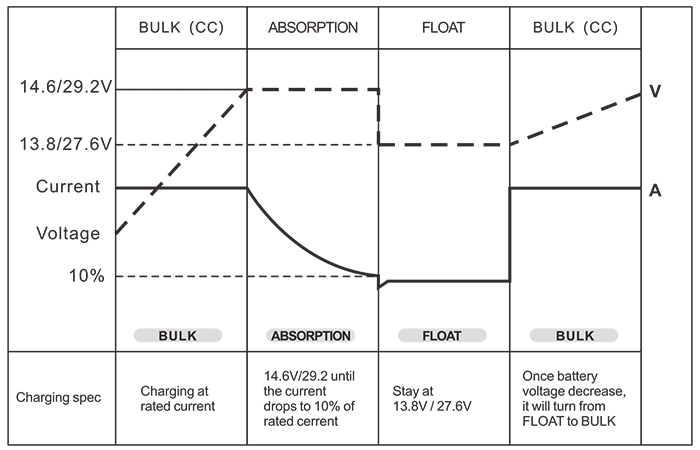 Controlul bateriei (încărcătoare de baterii în 3 trepte) Vrac / Absorbție / Plutire